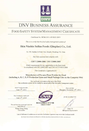 新日清制粉(青島)在食品的放心、安全上,致力于與日本同等的要求和標準。在原料的驗貨檢查、生產管理、交貨前的產品檢查等方面設有嚴格的基準。并且取得了食品安全管理體系的國際標準規格的ISO22000和FSSC22000的認證。還有在2014年的AIB(American Institute of Banking的縮寫,衛生方面的審查)審查中,獲得了915分。