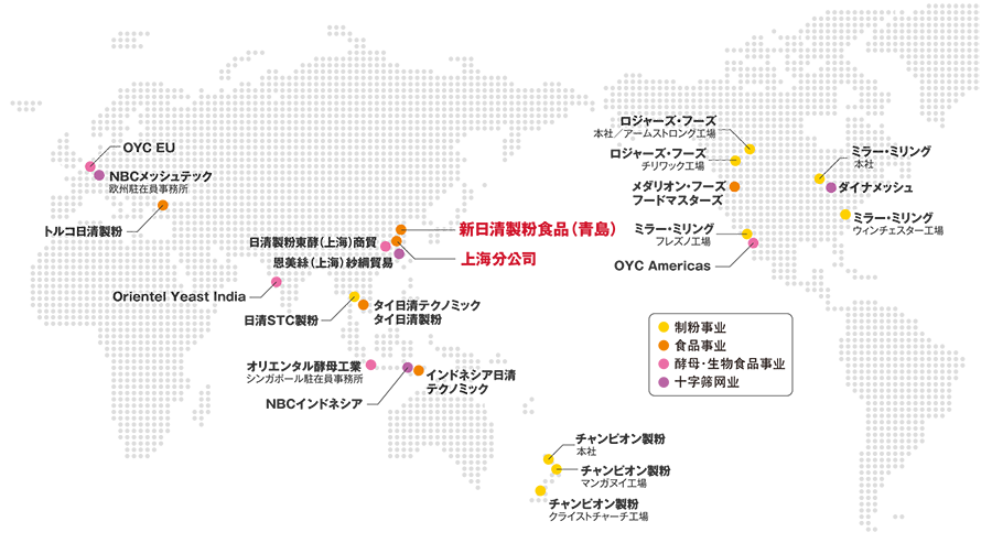 日清制粉集團在世界各地有30多家子公司,除了在日本、中國以外,還在北美、亞洲、歐洲、大洋洲等地開展了事業。